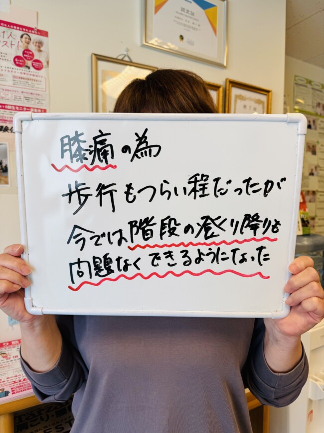 「通い始めて3週間ほどで膝の痛み激減し歩くのがスムーズになった」喜びの声いただきました。