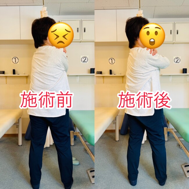 写真の通り、施術後は足首の安定に伴い、体幹の回旋可動域(捻る動き)まで劇的に改善しました。